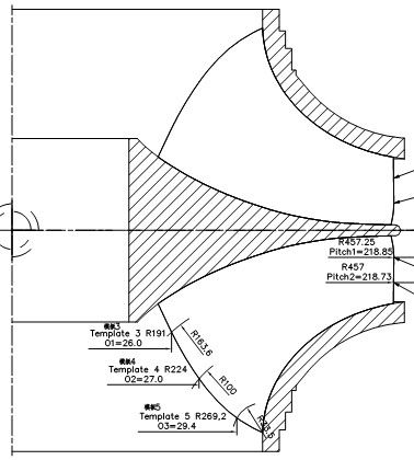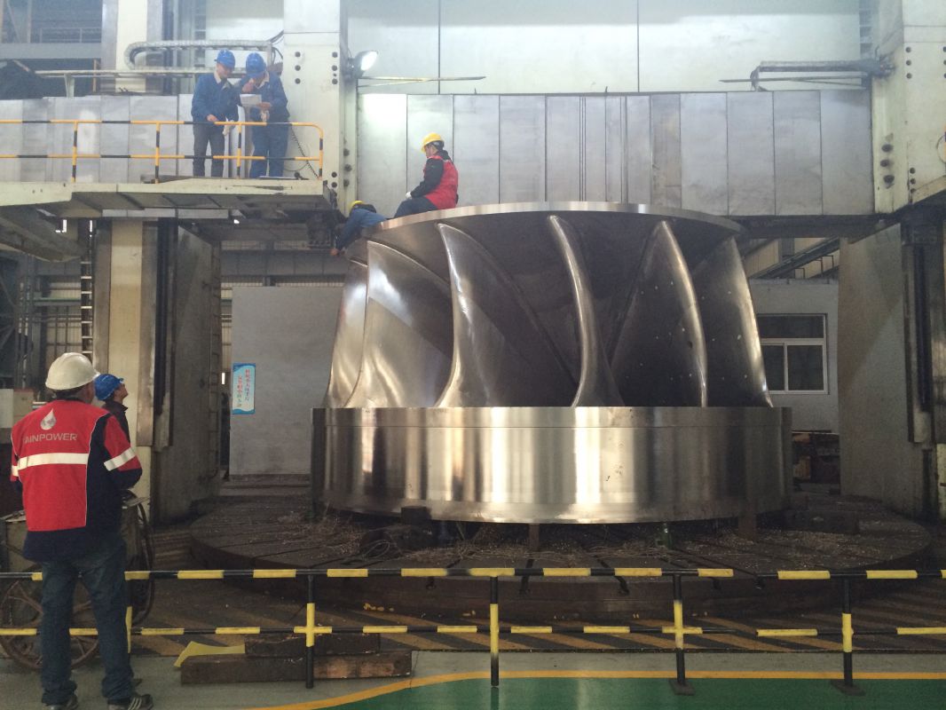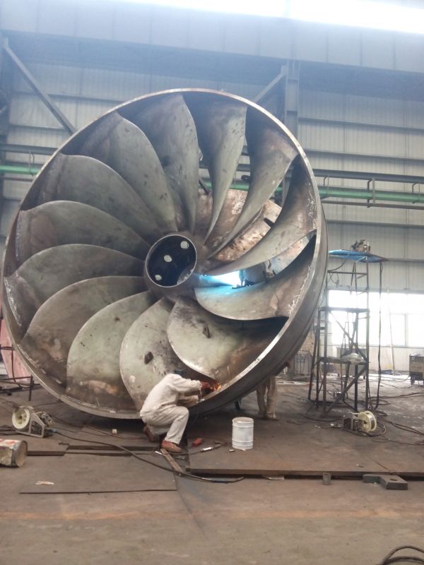 Vietas轉(zhuǎn)輪,葉片單片凈重量3169Kg,轉(zhuǎn)輪總重量81261Kg,直徑最大Φ5584mm,高度2925mm,由1個(gè)上冠、1個(gè)下環(huán)和13片葉片組裝焊接而成,轉(zhuǎn)輪材料為GX4CrNi13-4的馬氏體不銹鋼,焊縫厚度高達(dá)270mm,焊接工作量大,易變形,施焊順序較為復(fù)雜,焊接施工難度高,是公司目前生產(chǎn)的結(jié)構(gòu)和重量最大的焊接混流式轉(zhuǎn)輪。該轉(zhuǎn)輪按期焊接完工,一次驗(yàn)收合格,得到客戶認(rèn)可和高度評(píng)價(jià)。轉(zhuǎn)輪已發(fā)往瑞典VIETAS KRAFTSTATION TURBIN 1 電站服役。