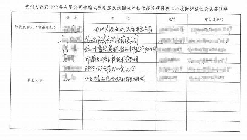 驗收人員信息見附件“杭州力源發(fā)電設備有限公司伸縮式噴漆房及線圈生產技改建設項目環(huán)保設施(水和氣部分)竣工環(huán)境保護驗收工作組簽到表”。
