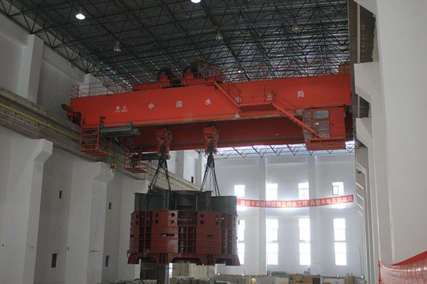 定子機(jī)座分2瓣,在工地安裝現(xiàn)場(chǎng)組圓、疊片及下線;定子整體通過上機(jī)架起吊。下圖為定子整體起吊,準(zhǔn)備吊入機(jī)坑。