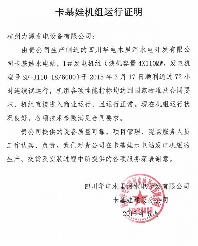 卡基娃項(xiàng)目4臺(tái)機(jī)組的成功運(yùn)行,充分證明了我公司設(shè)計(jì)能力強(qiáng)、生產(chǎn)能力大、質(zhì)量水平高的特點(diǎn)。我們相信,在公司全體員工的共同努力下,公司一定能夠再創(chuàng)佳績(jī)。