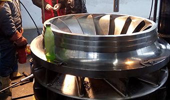 Vietas轉(zhuǎn)輪,葉片單片凈重量3169Kg,轉(zhuǎn)輪總重量81261Kg,直徑最大Φ5584mm,高度2925mm,由1個上冠、1個下環(huán)和13片葉片組裝焊接而成,